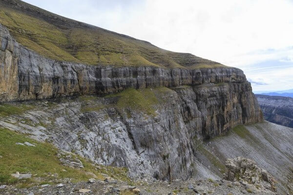 La vire est assez longue et offre de nombreux méandres sous la Punta Gallinero et le Pic Mondarruego (2746 m). Il y a entre 100 et 200 m de gaz jusqu’au gradin suivant. L’ensemble surplombe le fond du canyon de près de 1000 m !!