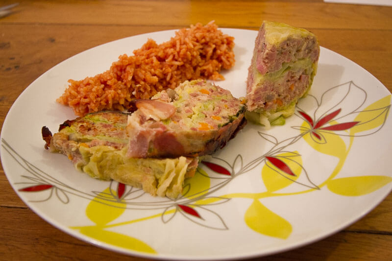 Mettre votre four à chauffer à 180°C. Graissez votre terrine avec le saindoux (ou ne mettez rien si vous en avez une en silicone). Chemisez la terrine avec les tranches de poitrine fumée puis avec une couche de feuilles de chou (utilisez les feuilles vertes pour cette première couche). Remplissez ensuite la terrine en alternant couches de farce et couches de chou à la manière d’un mille-feuilles. Pour finir refermez la terrine avec les feuilles vertes et la poitrine fumée. Recouvrez la terrine d’une feuille de papier alu et mettez la au four. Retirez l’alu au bout de 15 minutes et poursuivez la cuisson pendant 30 minutes. Retire la terrine du four, laissez la tiédir puis démoulez la. Servez la terrine de chou farci en tranches avec une salade (en entrée) ou éventuellement avec du riz tomaté (en plat principal). Si vous avez un surplus de farce et de chou comme ce fut mon cas, vous pouvez faire un chou farci plus « classique » en le moulant dans un grand bol allant au four.