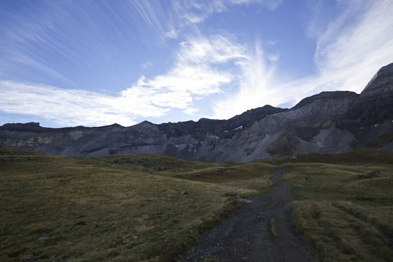 Départ du parking du cirque de Troumouse au petit matin après avoir fait un détour sur Gavarnie pour acheter du pain. Mise en jambe au fond du cirque sur un sentier quasiment plat jusqu’à un « col » (2133 m) qui précède les lacs des Ayres (qui sont vide au mois de septembre). Nous suivont à partir de là un sentier cairné qui mêne dans les éboulis au pied des parois du cirque.
